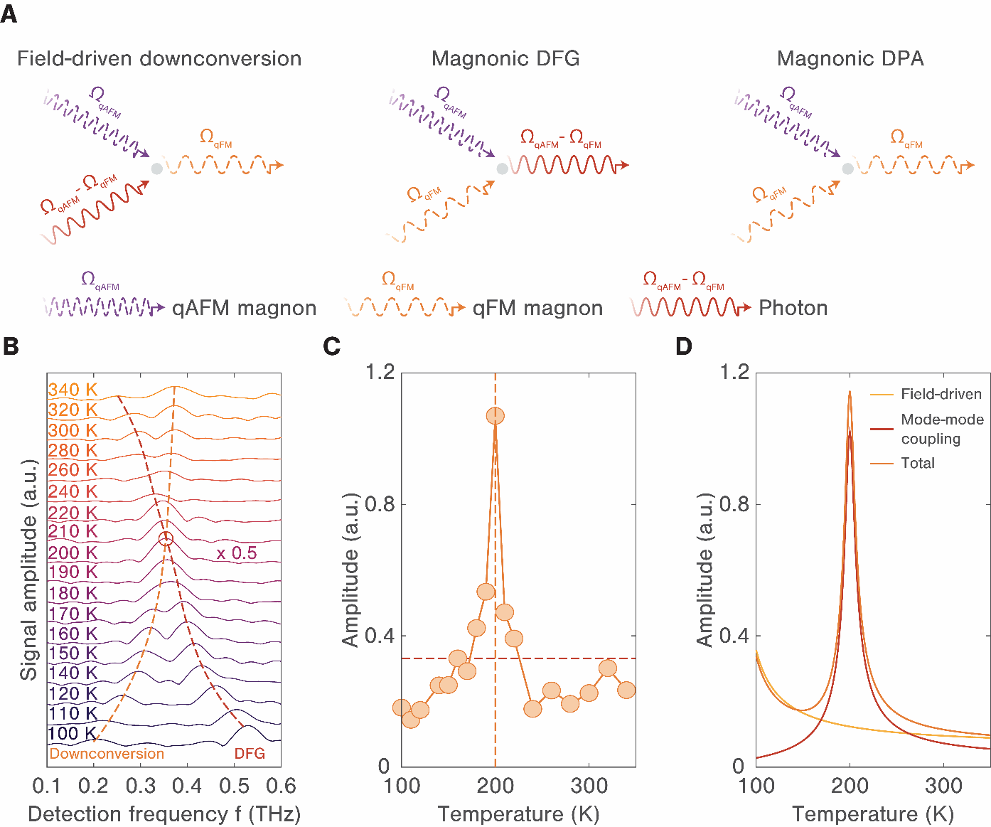 在这一工作中,研究团队通过在不同温度下对稀土反铁磁体氧化物ErFeO3材料单晶的系统研究,发现体系准反铁磁(qAFM)和准铁磁(qFM)磁子模式的频率变化规律,在特定温度下材料的准反铁磁模式频率恰好是准铁磁模式频率的两倍,满足参量共振条件,为受激参量下转换过程提供了关键的频率匹配条件。该工作同时研究了不同温度下的下转换信号的谱线切割图以及信号幅度的温度依赖关系,发现当满足参量共振条件时,信号幅度显著增强,突出了该研究在揭示非线性磁子学现象和实现磁子信号调控方面的新现象。该研究成果加深了人们对反铁磁体中非线性磁子相互作用的理解,也为未来开发具有超高带宽的磁子信号处理技术提供了重要的理论基础和实验依据,有望催生出一系列新型的自旋电子学和磁子学器件,在诸如高灵敏度的磁子探测器、高效信号放大器以及量子信息处理器等领域具有潜在的全新应用前景。