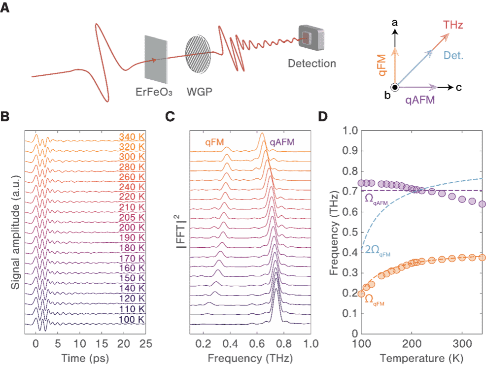 近日,材料基因组工程研究院/理学院曹世勋教授团队与麻省理工学院及德克萨斯大学奥斯汀分校等共同组成一支国际合作研究团队,在《Science Advances》期刊上发表了题为 “Terahertz stimulated parametric downconversion of a magnon mode in an antiferromagnet” 的研究论文,该工作以反铁磁绝缘体材料ErFeO3为研究对象,通过极化选择性二维太赫兹光谱技术,激发了两个不同的相干磁子模式,并发现在特定条件下,低频磁子模式会发生放大现象,成功揭示了反铁磁体中相干磁子模式的受激参量下转换过程,为非线性磁子学和自旋电子学的发展开辟了新途径。